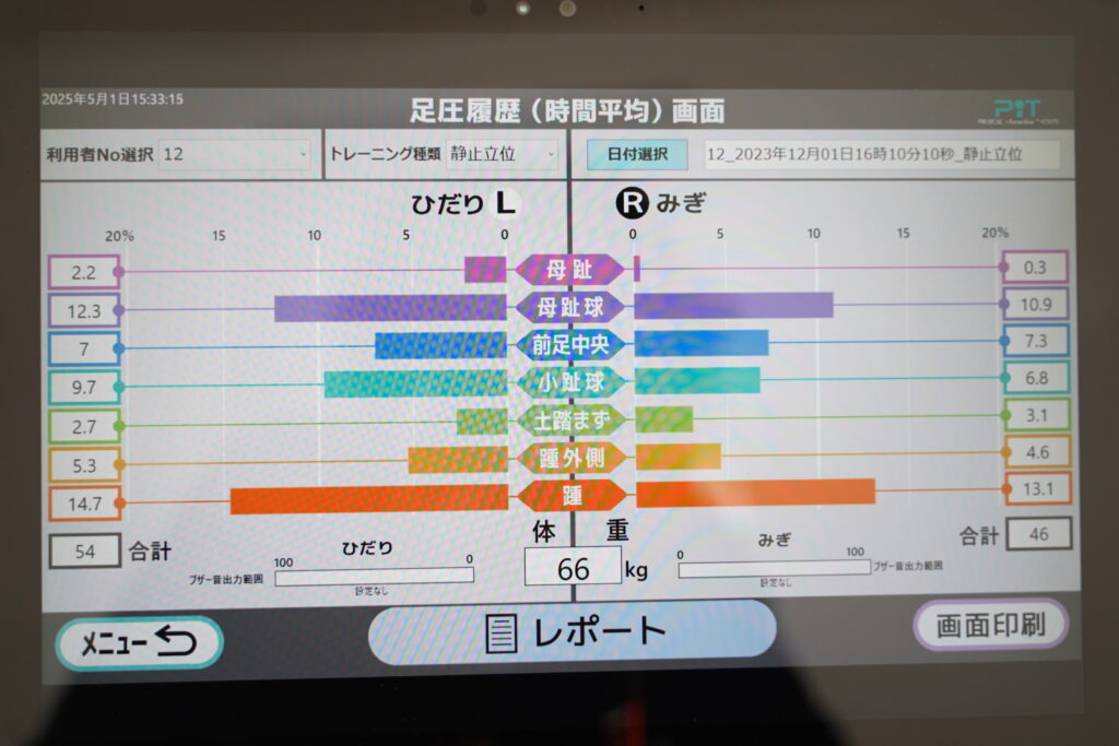 ◉ 足圧測定:身体荷重の可視化と改善指導